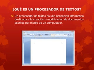 Este documento describe los principales tipos de procesadores de texto como Microsoft Word y WordPerfect, y resume la evolución de los procesadores de texto desde las máquinas de escribir hasta las versiones digitales modernas. También explica cómo utilizar las funciones básicas de formato, inserción de imágenes y tablas, y creación de encabezados, notas al pie y tablas de contenido en Microsoft Word.