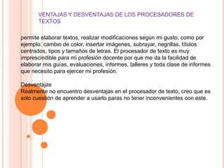 Este documento describe las ventajas y desventajas de los procesadores de texto, así como cómo usar sus funciones básicas. Explica que los procesadores de texto permiten editar textos fácilmente y agregar elementos como imágenes y formato. También enumera algunos procesadores de texto populares como Microsoft Word y OpenOffice Writer, e indica cómo crear documentos, guardar, imprimir y acceder a ayuda dentro de estos programas. Finalmente, menciona que se pueden agregar tablas, fórmulas, encabezados y pies de p