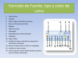Este documento describe los diferentes formatos de texto que se pueden aplicar en Microsoft Word, incluyendo el tipo y tamaño de fuente, negrita, cursiva, subrayado, superíndice e subíndice, color de texto, y alineación y sangría de párrafos. También explica que en Word los formatos se clasifican en formatos de caracteres, formatos de párrafos y otros formatos avanzados.