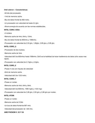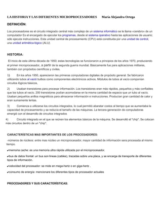 El documento describe la historia y características de los microprocesadores. Explica que los primeros ordenadores usaban tubos de vacío y transistores, mientras que los circuitos integrados permitieron reducir el tamaño y aumentar la capacidad. Luego se desarrolló el "chip" donde se reunían los elementos básicos. Describe las características clave de los procesadores modernos como el número de núcleos, memoria cache, velocidad y consumo de energía. Finalmente, detalla las especificaciones de populares procesadores Intel y AMD.
