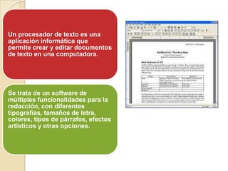 Los procesadores de texto son aplicaciones informáticas destinadas a la creación, edición, modificación, corrección e impresión de documentos de texto. Permiten trabajar con diferentes tipos de fuentes, tamaños de letra, formatos de párrafo, corrección ortográfica y gramática, e incluir imágenes y tablas. Algunos de los más populares son Microsoft Word, WordPerfect y OpenOffice Writer.