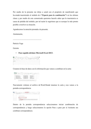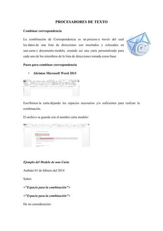 La combinación de correspondencia es un proceso para insertar datos de una lista de direcciones en una carta modelo, creando una carta personalizada para cada persona. Para combinar correspondencia se crea primero una carta modelo en Word dejando espacios para los datos, luego se crea una base de datos en Excel con la información, y finalmente en Word se insertan los campos combinados enlazándolos a la base de datos, generando así múltiples cartas personalizadas. Una plantilla proporciona una estructura predefinida y permite guardar estilos, formatos, y