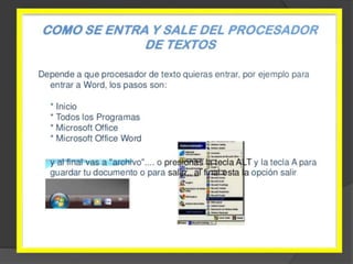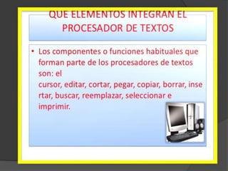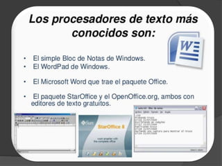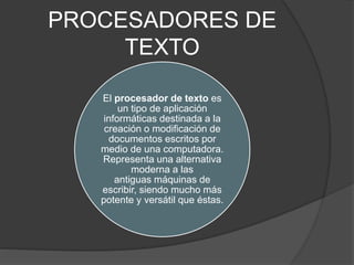 Los procesadores de texto son aplicaciones esenciales para crear y modificar documentos, superando las limitaciones de las máquinas de escribir. Ofrecen múltiples funcionalidades tipográficas y organizativas, permitiendo la inclusión de gráficos, imágenes y una fácil corrección de errores. Sin embargo, también presentan desventajas, como la dependencia del usuario para mantener la ortografía y gramática correcta.