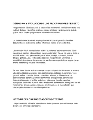 Este documento describe la definición, evolución e historia de los procesadores de texto, así como sus principales características y tipos. Explica que los procesadores de texto permiten crear, editar y dar formato a documentos de manera más versátil que las máquinas de escribir. También describe algunos procesadores de texto populares como Microsoft Word, Lotus Word Pro y WordPerfect, así como opciones más básicas como WordPad y Bloc de notas. Finalmente, explica que existen otros tipos de procesadores como TeX y LaTeX orientados a