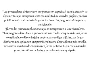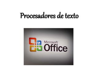 Este documento describe los procesadores de texto y hojas de cálculo. Explica que los procesadores de texto permiten crear, editar e imprimir documentos con texto y gráficos de forma sencilla. También enumera algunos procesadores de texto populares como Microsoft Word y WordPad. Luego, define las hojas de cálculo como documentos que permiten manipular datos numéricos y de texto en celdas organizadas en filas y columnas, y realizar cálculos complejos. Finalmente, brinda detalles sobre el origen y uso básico de las celdas