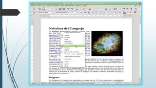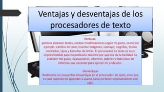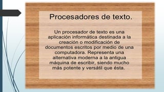 Este documento describe las características y funciones principales de los procesadores de texto. Explica que permiten insertar, copiar, borrar y pegar texto, y aplicar formatos como fuente, color y estilo. También pueden buscar y reemplazar texto, crear tablas y columnas, y administrar archivos. Los ejemplos más conocidos son Microsoft Word, OpenOffice Writer y alternativas de código abierto como AbiWord.