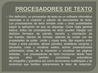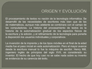 Los procesadores de texto son software diseñado para crear y editar documentos de texto. Permiten formatos de párrafo, fuentes y estilos, y funciones como cortar, copiar y pegar texto. Incorporan correctores ortográficos y gramaticales. La historia del procesamiento de texto comenzó con la imprenta y máquinas de escribir, pero avanzó con el desarrollo de la cinta magnética por IBM en 1964, permitiendo corregir y reutilizar texto sin reescribirlo completamente. Esto marcó el inicio del proces