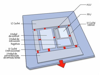 Este documento describe la historia y el funcionamiento de los microprocesadores. Comenzó como dispositivos del tamaño de un armario y ahora son chips minúsculos. Explica que el procesador es el cerebro del ordenador que procesa datos y ejecuta instrucciones almacenadas en la memoria. También describe las diferentes partes de un procesador como la unidad de control, la caché, los registros y las unidades funcionales que trabajan juntas para procesar la información.