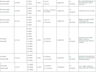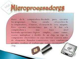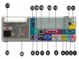 El microprocesador es el componente principal de una computadora que ejecuta instrucciones y realiza operaciones lógicas. El primer microprocesador de 16 bits fue el Intel 8086, lanzado en 1978. Los puertos seriales, USB, VGA, COM y RJ-45 son diferentes tipos de puertos de entrada/salida que permiten conectar periféricos y redes a la computadora.