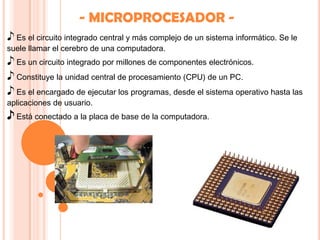 El documento describe los principales componentes de una computadora, incluyendo el microprocesador, tarjeta de video, tarjeta de sonido, memoria RAM y placa madre. Explica que el microprocesador es el componente central que ejecuta los programas, la tarjeta de video procesa los datos para mostrar imágenes, y la tarjeta de sonido controla el audio. Además, detalla que la memoria RAM almacena temporalmente los datos durante el uso y que la placa madre conecta todos los componentes.