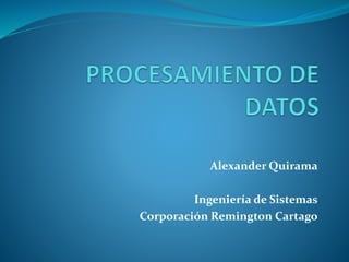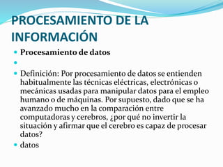 Este documento habla sobre el procesamiento de información. Define procesamiento de datos como las técnicas usadas para manipular datos para uso humano o de máquinas. Define dato como un símbolo que representa algo concreto o abstracto, y cuando los datos se enlazan se convierten en información. Explica que un sistema está compuesto de elementos interrelacionados que trabajan juntos hacia un objetivo común, y que un proceso consta de ingreso de datos, memorización, procesamiento y salida de información.