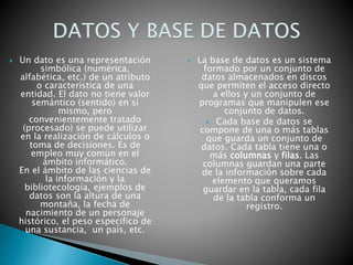 El documento describe los conceptos básicos de las bases de datos, incluyendo que una base de datos es un sistema formado por un conjunto de datos almacenados que permiten el acceso directo a ellos y programas que manipulan los datos. Las bases de datos se componen de tablas con filas y columnas para almacenar la información de cada elemento guardado. Los datos son representaciones simbólicas que no tienen sentido por sí mismos pero que pueden usarse para cálculos o toma de decisiones cuando son procesados.