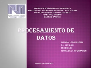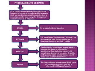 El documento describe los pasos del procesamiento de datos, incluyendo la recopilación de datos primarios, la entrada de datos a un bloque central para procesamiento, y el proceso donde los datos se convierten en información significativa a través de operaciones. Finalmente, la salida produce resultados en forma de informes que sirven como base para la toma de decisiones.