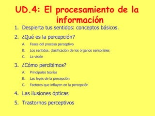 Este documento trata sobre la percepción y los sentidos humanos. Explica las diferentes teorías sobre cómo percibimos, incluyendo el asociacionismo, la teoría de la Gestalt y el cognitivismo. También describe los principales sentidos, como la visión, y las leyes que rigen la percepción, como la figura-fondo, la pregnancia y la constancia perceptiva. Finalmente, menciona algunas ilusiones ópticas como la habitación de Ames.