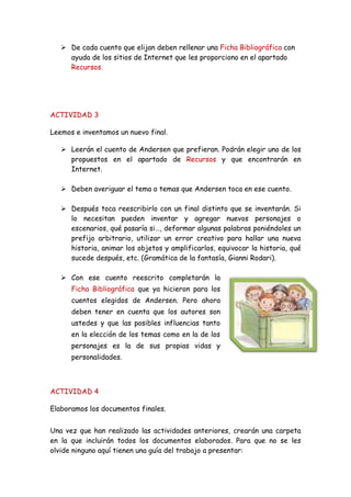 El documento describe un proyecto en grupo sobre Hans Christian Andersen que consiste en 4 actividades: 1) estudiar la biografía de Andersen y redactar un resumen, 2) elegir dos cuentos de Andersen y completar fichas bibliográficas, 3) leer e inventar un nuevo final a uno de los cuentos, y 4) elaborar documentos finales que incluyen una biografía de Andersen, fichas de los cuentos elegidos, un cuento propio con un final inventado, y una autoevaluación. Los estudiantes trabajarán en grupos de 4 personas