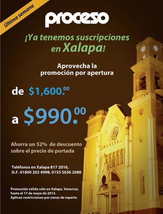Este documento presenta el organigrama de la revista semanal mexicana Proceso, incluyendo los nombres y cargos de los miembros del consejo de administración, la dirección, subdirecciones y departamentos. También incluye la lista de reporteros, corresponsales, colaboradores y personal de diferentes áreas como redacción, fotografía, diseño, comercialización y administración.