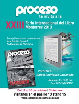 Este documento presenta la lista de personal de la revista Proceso. Incluye los nombres de los miembros del consejo de administración, la dirección, los subdirectores, reporteros, corresponsales, editores de diferentes secciones como cultura, espectáculos y deportes, el personal de fotografía, diseño, comercialización, finanzas, atención a suscriptores y más. También incluye la información de contacto de la revista como su dirección, teléfonos y correo electrónico.