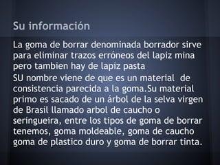 El documento describe el proceso de producción de las gomas de borrar. Se obtiene el caucho de árboles de caucho en Brasil mediante un proceso llamado "sangrado", donde se hace una incisión en la corteza para extraer el látex. Luego, el látex se mezcla con agua y químicos para formar una masa sólida que se tritura para darle consistencia a la goma de borrar. Finalmente, se añaden más químicos para darle a la goma sus propiedades finales y hacerla apta para su