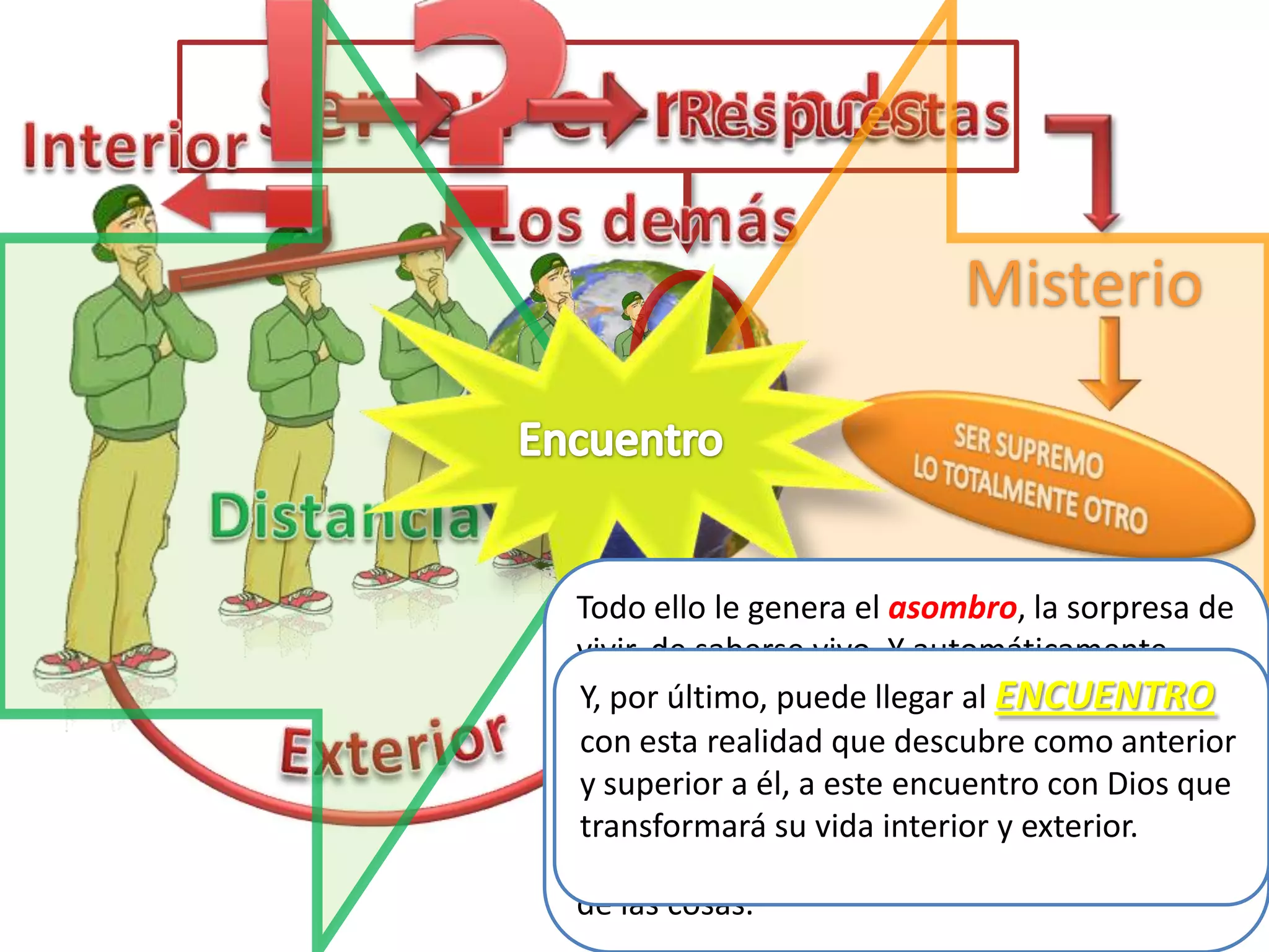 El documento describe las diferentes etapas que experimenta un ser humano en su búsqueda de sentido. Primero se siente asombrado por la vida y surge la pregunta por su identidad y propósito. Luego descubre varias respuestas filosóficas y religiosas y el gran misterio que subyace a la realidad. Finalmente, puede llegar a un encuentro con una realidad superior que transformará su interior y exterior.