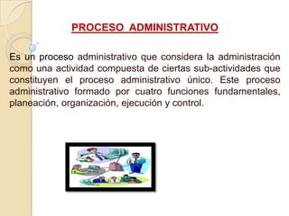 Este documento describe el proceso administrativo y sus cuatro funciones fundamentales: planeación, organización, ejecución y control. Explica que la planeación implica establecer objetivos y planes, la organización distribuye el trabajo, la ejecución implementa los planes, y el control supervisa el progreso y realiza ajustes. También define actividades clave para cada función y principios de la dirección como la coordinación de intereses y resolución de conflictos.