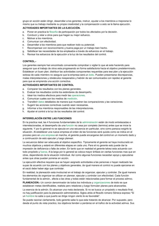 Este documento describe las cuatro funciones fundamentales del proceso administrativo: planeación, organización, ejecución y control. La planeación implica establecer objetivos y planes de acción. La organización involucra distribuir tareas entre miembros y establecer relaciones. La ejecución se refiere a llevar a cabo las tareas. El control compara los resultados con los planes para realizar ajustes. Las funciones están interrelacionadas y no ocurren de forma secuencial estricta.