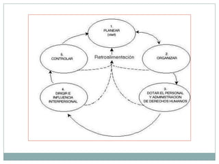 Este documento resume los componentes esenciales del proceso administrativo en una empresa, incluyendo la planeación, organización, dirección y control. Explica que la planeación es la primera etapa y busca influir en el futuro mediante el establecimiento de objetivos y cursos de acción. Luego describe las otras etapas y sus principios fundamentales, así como las actividades clave de cada una. El documento provee una explicación concisa pero completa de las principales partes del proceso administrativo.