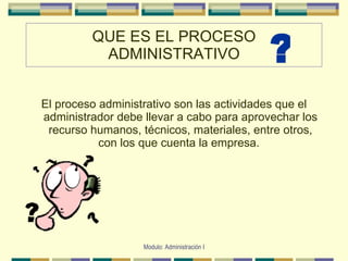 El documento describe el proceso administrativo y la planeación. Explica que el proceso administrativo involucra actividades como aprovechar recursos para lograr objetivos. Luego describe las ventajas del proceso administrativo y las etapas de la planeación como determinar objetivos, tomar decisiones y elaborar planes. Finalmente, explica conceptos como planeación estratégica, operativa, análisis FODA y la importancia de definir la misión y visión de una organización.
