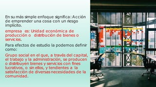 Este documento describe los conceptos básicos de la empresa y su proceso administrativo. Explica que una empresa es una unidad económica de producción o distribución de bienes o servicios con fines lucrativos o de servicio a la comunidad. Luego describe las etapas del proceso administrativo, incluyendo la planeación, organización, dirección e integración y control. Para cada etapa, explica sus elementos, importancia y principios de aplicación.