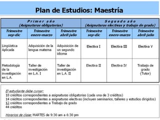 El documento describe dos programas de posgrado: una Maestría en Lingüística Aplicada y una Especialización en la Enseñanza de Idiomas Extranjeros en Inglés. Ambos programas requieren la aprobación de un programa nivelatorio de tres trimestres antes de comenzar el posgrado para dominar el registro académico y revisar las principales tendencias en lingüística. La Maestría se enfoca en la investigación mientras que la Especialización busca mejorar las habilidades de los profesores de inglés.
