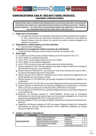 Se convoca a la contratación de personal mediante el régimen de contratación administrativa de servicios para las instituciones educativas de educación secundaria en Huánuco, conforme al programa presupuestal 0090 del año fiscal 2017. El proceso incluye etapas de evaluación curricular, técnica y entrevistas, y se regirá por diversas leyes y normativas vigentes. Existen vacantes disponibles en varias instituciones educativas, y los postulantes deben presentar documentación específica en plazos establecidos.