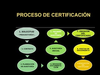 El resumen describe las principales etapas del proceso de certificación: 1) la solicitud y contrato, 2) la planificación de la auditoría inicial, 3) la revisión de la documentación de la compañía, 4) la auditoría inicial y el informe, 5) la certificación inicial, 6) las visitas de seguimiento cada 6 meses, y 7) la renovación periódica del certificado.