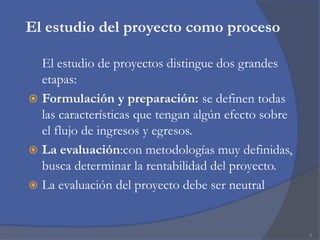 El documento describe el estudio de proyectos como un proceso cíclico que consta de dos etapas principales: la formulación y preparación, y la evaluación. La formulación y preparación incluye la recopilación de información y sistematización de datos, mientras que la evaluación mide la rentabilidad del proyecto y realiza análisis cualitativos y de sensibilidad. El documento también explica que un estudio de proyecto completo requiere análisis de mercado, técnico, organizacional y financiero.