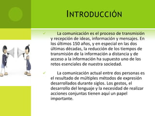 Este documento describe el proceso comunicativo y sus elementos fundamentales. Explica que la comunicación implica la transmisión y recepción de ideas entre un emisor y receptor a través de un código y canal. Además, identifica las funciones del lenguaje como referencial, emotiva, conativa y metalingüística. Finalmente, analiza los tipos de comunicación como pública, privada, interna, externa, recíproca y unilateral.