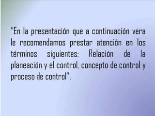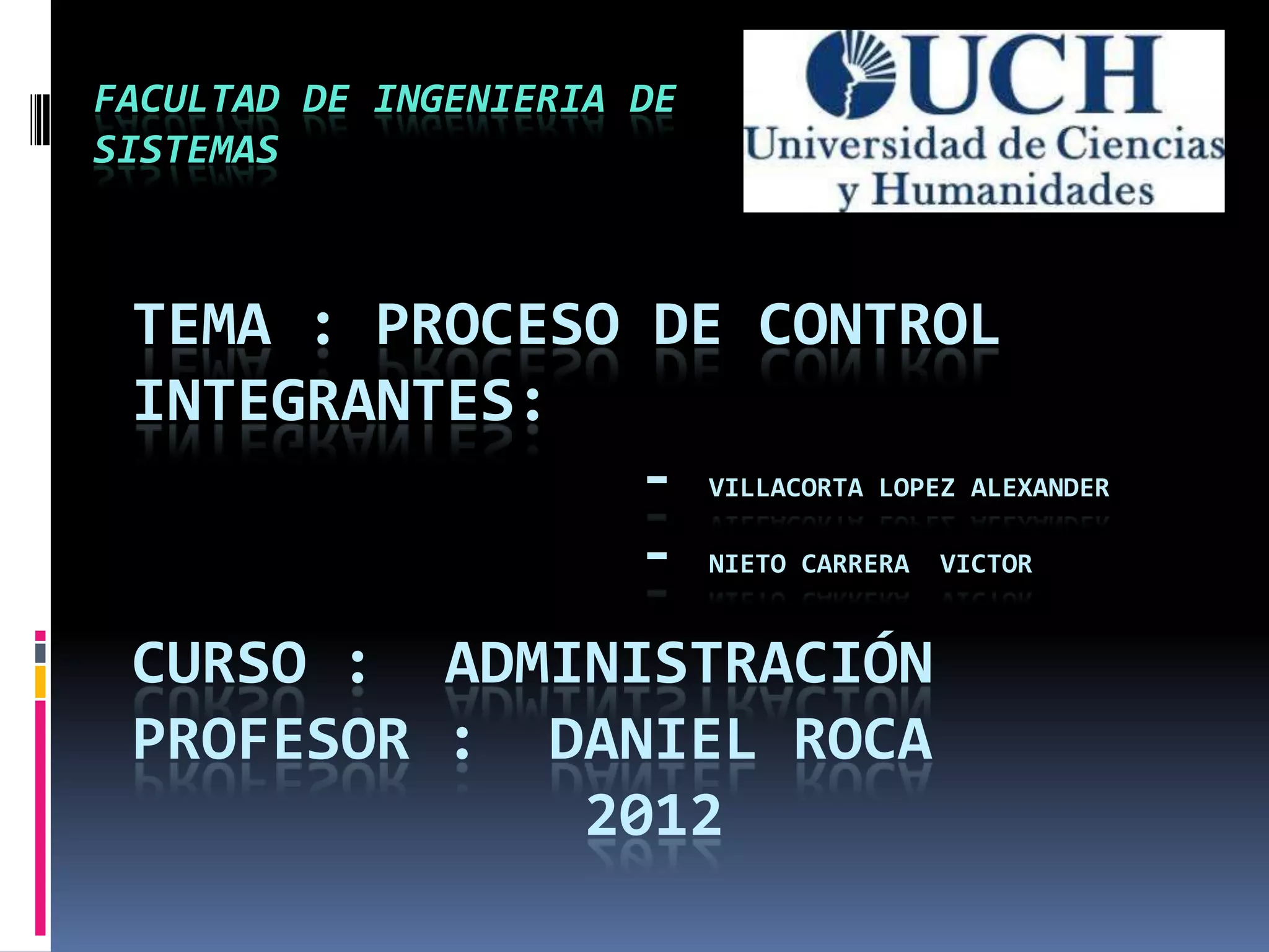 Este documento presenta un resumen sobre el proceso de control realizado por Victor Nieto Carrera y Alexander Villacorta Lopez como parte de un curso de Administración en la Facultad de Ingeniería de Sistemas en el 2012, el cual incluye información sobre control estratégico, control en áreas funcionales, y control operativo obtenida de varias fuentes en internet y un libro de texto.