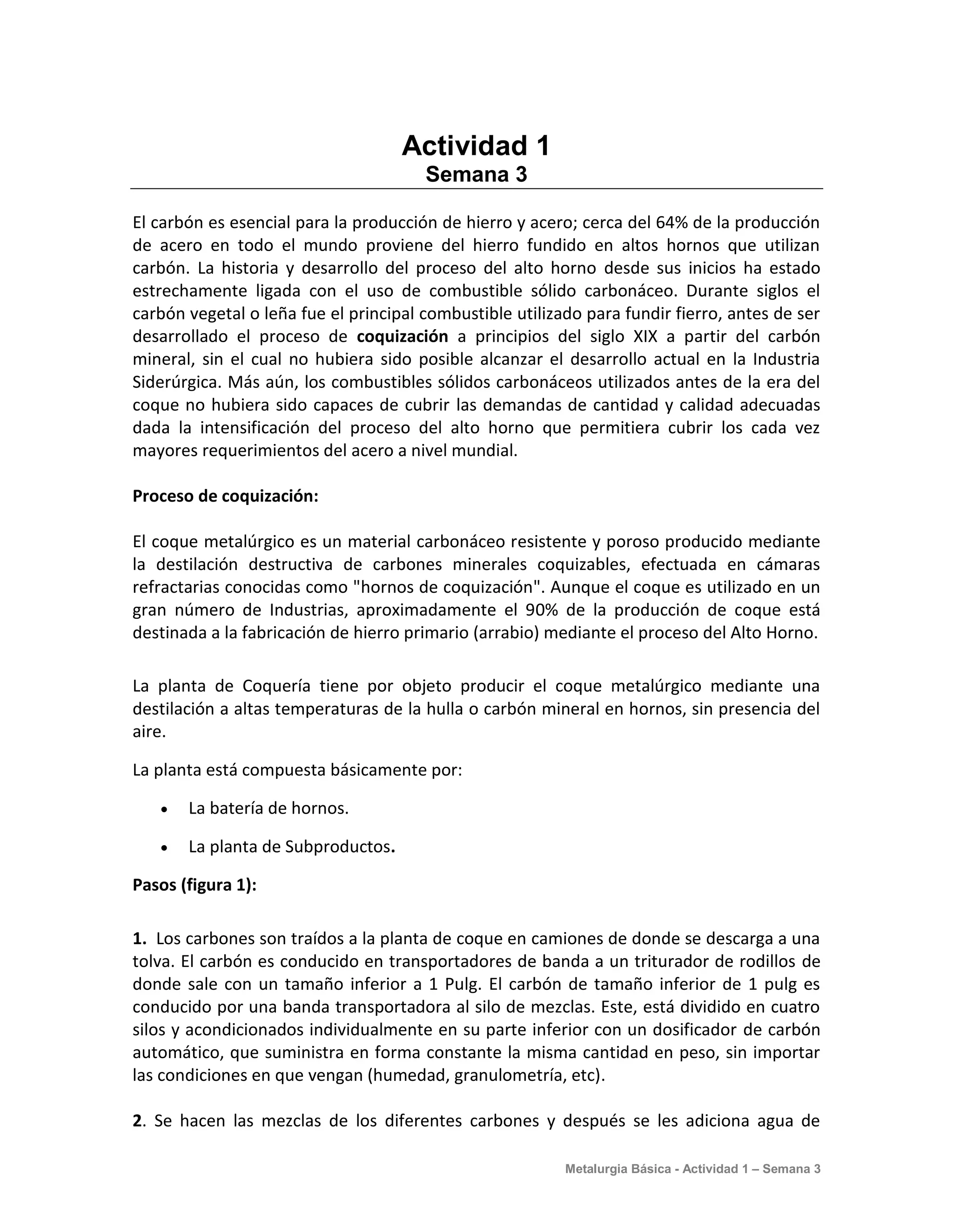 El documento describe el proceso de coquización, que produce coque mediante la destilación de carbón a altas temperaturas. El coque es un material carbonáceo necesario para la producción de hierro y acero en altos hornos. El proceso de coquización incluye la mezcla y molienda de carbones, la carga de los hornos, la destilación durante 20 horas, el deshorne y enfriamiento del coque, y su trituración y cribado para lograr el tamaño adecuado para su uso en altos hornos.
