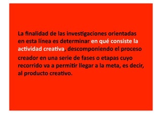 El documento describe el proceso creativo como un conjunto de etapas internas que involucran la definición de un problema, la generación de ideas y soluciones, y la evaluación crítica de las soluciones. Los investigadores han propuesto varios modelos para explicar este proceso, incluidos los modelos clásicos que lo describen como una secuencia de fases y los modelos cognitivos que intentan explicar los mecanismos internos involucrados. La mayoría de los modelos presentan tres etapas clave: la definición del problema, la generación de ideas y soluc