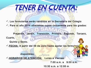 El documento detalla el proceso de admisiones para el año 2014 en un colegio. Se ofrecen cupos para grados desde prejardín hasta sexto. Los formularios estarán disponibles del 9 de julio en adelante en la secretaría del colegio. Para adquirir un formulario se debe cancelar $40.000 pesos y presentar documentos como el último boletín y paz y salvo. Los padres deben asistir a una inducción el 16 de noviembre y los estudiantes presentarán un examen de admisión en noviembre.