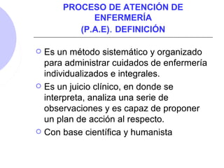 Este documento describe el proceso de atención de enfermería (PAE), incluyendo sus etapas de valoración, diagnóstico, planificación, ejecución y evaluación. Explica cada etapa en detalle, como reunir datos en la valoración, formular diagnósticos, establecer objetivos y acciones en la planificación, implementar el plan en la ejecución, y evaluar los resultados en la última etapa. El PAE provee un enfoque sistemático para brindar cuidados de enfermería individualizados e integrales centrados