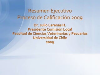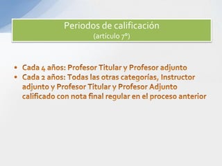 Este documento describe los procedimientos y comisiones involucradas en el proceso de calificación de académicos. Establece las fechas de inicio y término del proceso, así como la constitución de las Comisiones de Calificación, Apelación y Superior. Explica cómo se realiza la calificación, los recursos disponibles y las funciones de cada comisión en el proceso.