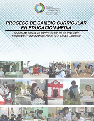 Este documento presenta las bases y orientaciones para un proceso de cambio curricular en la educación media venezolana. Se recogen las observaciones y sugerencias de docentes, estudiantes y otras partes interesadas tras una primera consulta nacional. El cambio curricular abarcará más que los planes de estudio, involucrando también los propósitos educativos, las prácticas pedagógicas, y la participación de la comunidad educativa. El proceso busca desarrollar el potencial creativo de los estudiantes y formar una ciudadanía activa,