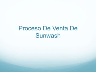 El documento compara los procesos de compra y venta de Sunwash, una empresa que ofrece lavado de carros a domicilio. Describe los pasos en los procesos de venta de Sunwash y compra del cliente, observando que están alineados. También señala que los clientes a menudo intentan pagar con tarjeta de crédito, que Sunwash actualmente no acepta, y que el nombre de la empresa "Sunwash" no es muy recordado por los clientes.