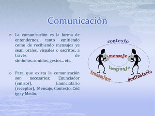El documento describe los elementos y funciones del proceso comunicativo. Explica que la comunicación requiere de un emisor, receptor, mensaje, contexto, código y medio. Define cada uno de estos elementos clave: el emisor envía el mensaje, el receptor lo recibe y decodifica, el mensaje es la información transmitida, el contexto son las circunstancias, el código son los símbolos compartidos, y el medio es cómo se transmite el mensaje.