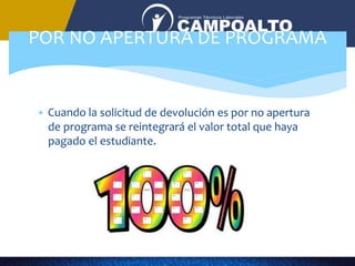 Este documento proporciona instrucciones sobre los procesos y requisitos de devolución de matrícula para estudiantes. Indica que para solicitudes de devolución por no apertura de programa se reintegrará el valor total pagado, mientras que por retiro voluntario se descontarán $50,000. También enumera los documentos requeridos para la solicitud y los datos necesarios para realizar una transferencia bancaria de los fondos reembolsados.