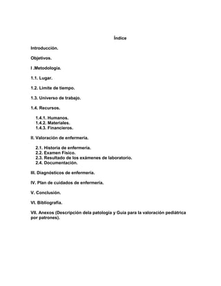 Este documento presenta el proceso de enfermería para una paciente pediátrica con diagnósticos de neumonía y parálisis cerebral infantil. El objetivo es favorecer su rehabilitación y reintegrarla con su familia. Se realizó una valoración completa que incluyó historia clínica, examen físico y resultados de laboratorio. Se identificaron varios diagnósticos de enfermería y un plan de cuidados centrado en la paciente.