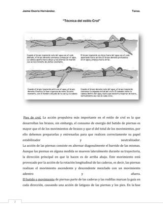 El documento aborda la técnica del estilo crol y el proceso de enseñanza de la natación. Se discuten aspectos fundamentales como el movimiento de piernas, la coordinación con brazos y respiración, y se describen etapas de aprendizaje que van desde la adaptación al medio acuático hasta la propulsión. Además, se analizan técnicas específicas y su impacto en el rendimiento del nadador.