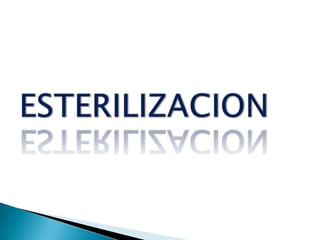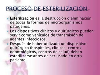 El documento describe los diferentes métodos y procesos de esterilización de dispositivos médicos. Explica que la esterilización busca eliminar microorganismos patógenos para prevenir infecciones. Detalla métodos como el autoclave de vapor, óxido de etileno y plasma de peróxido de hidrógeno, así como la importancia de preparar adecuadamente el material y utilizar indicadores para garantizar la esterilización.