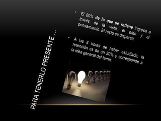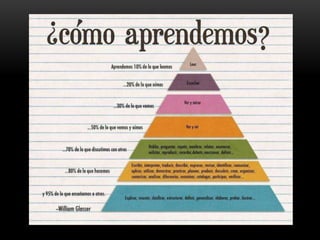 El documento presenta información sobre el proceso de aprendizaje. Explica que el aprendizaje implica un cambio duradero en la capacidad o conducta de una persona que no puede atribuirse solo al crecimiento. Luego describe diferentes tipos de aprendizaje como la imitación, repetición, ensayo y error. Finalmente, identifica factores cognitivos, afectivos y ambientales que influyen en el aprendizaje, así como operaciones mentales y hábitos como la concentración y organización que facilitan el proceso de aprendizaje.