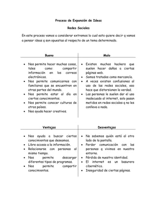 Este documento analiza las redes sociales desde diferentes perspectivas. Menciona algunas ventajas de las redes sociales como permitir la comunicación con familiares en otras partes del mundo y estar al día con nuevos conocimientos. También señala algunos riesgos como la pérdida de privacidad y la posibilidad de encontrar hackers o información falsa. El documento concluye analizando el uso adecuado de las redes sociales para adquirir conocimientos versus un uso inadecuado que puede llevar al abuso de la información.
