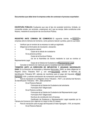 1) El documento describe los pasos y documentos requeridos para exportar productos de Colombia. Estos incluyen la constitución de la empresa, el registro ante la Cámara de Comercio, trámites ante la DIAN para obtener el NIT y autorización de facturación, y registro en el Ministerio de Comercio Exterior. 2) También se requiere registro de productores, determinación de origen de productos, y registro ante el ICA de predios y como exportador. 3) Finalmente, se mencionan documentos necesarios para el proceso de exportación como fact