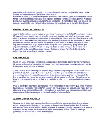 El documento describe el proceso de creación de una moneda desde los primeros bocetos hasta la acuñación final. Inicialmente, el departamento de moneda crea varios bocetos que son estudiados y uno es seleccionado. Luego, el diseño seleccionado se modela en plastilina y se usa para crear moldes en escayola y resina epoxi. Estos moldes se usan para grabar punzones de máquina en acero. Los punzones se usan para crear matrices e impresores, los cuales finalmente se usan para ac